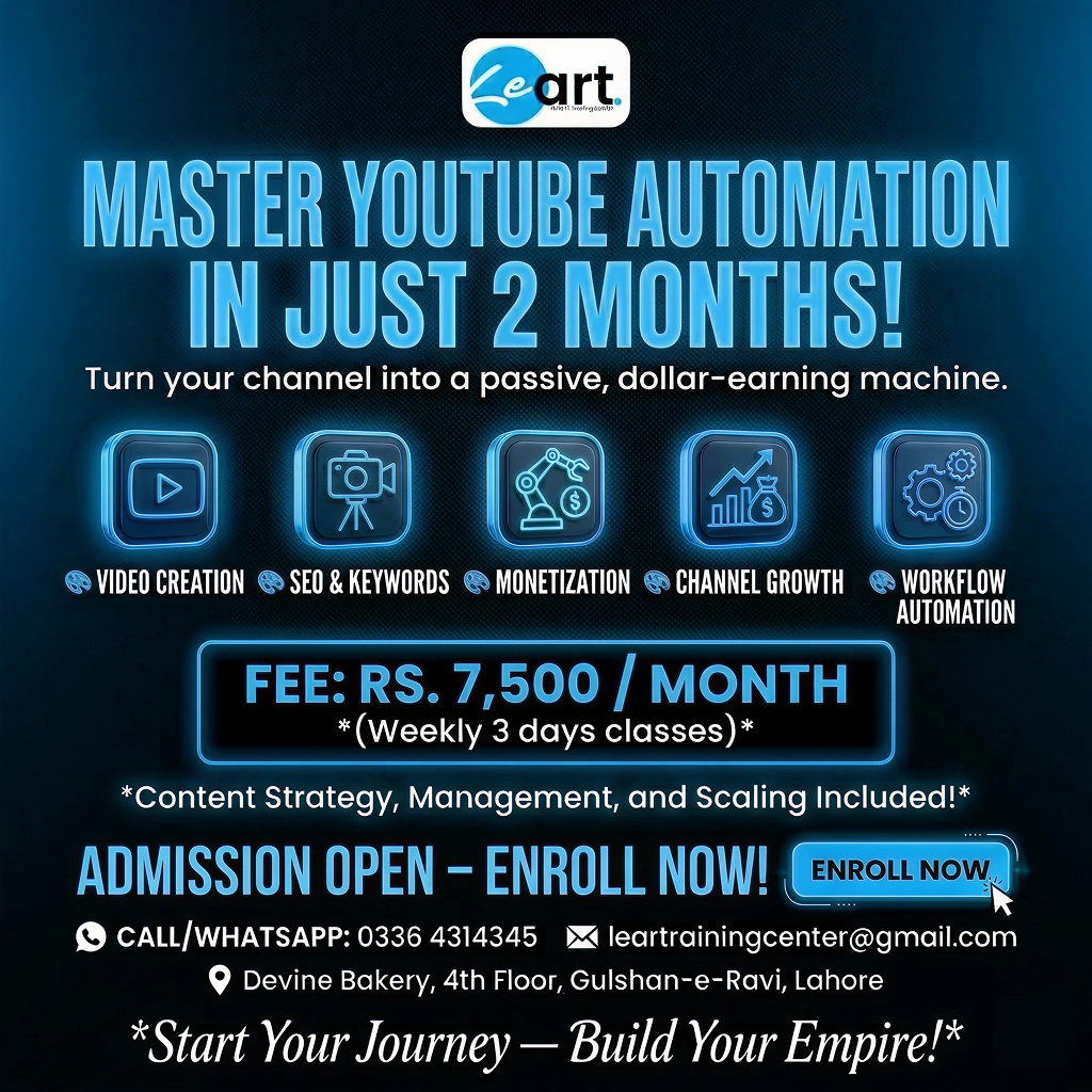 Master YouTube Automation in 60 days. Skip the fluff and build a cash-cow channel with real-world case studies. Join onsite in Lahore or online for just PKR 7500/month. Master AI tools, Faceless content, and Monetization today.